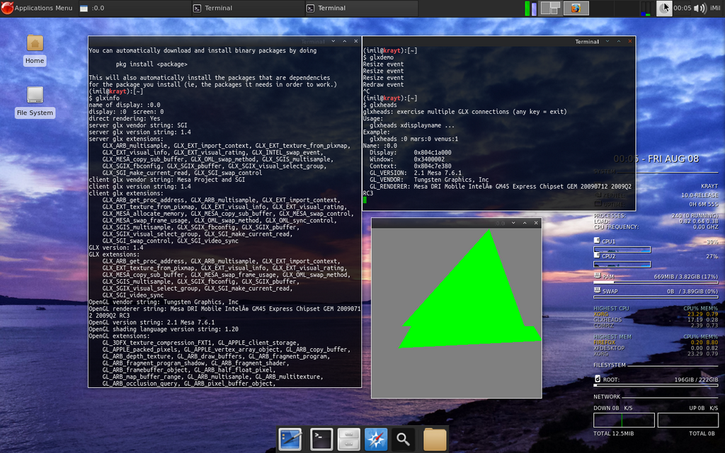I recently borrowed a Dell machine at work, model E4300, a nice little laptop whose graphical display is done by a much common Intel 4500MHD. While the card worked out of the box for a classical 2D display with a fresh FreeBSD 10.0 install, I noticed that DRM/DRI (in short, 3D) wasn’t available; I knew it was somewhat related to the new KMS/GEM infrastructure, so I began a few searches and found those useful resources: